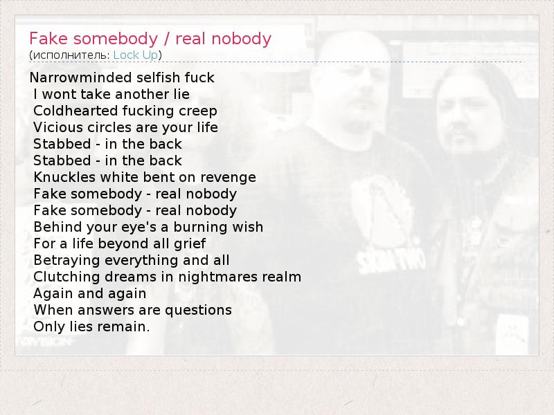 ГлавнаяИсполнителиLock UpFake somebody / real nobody