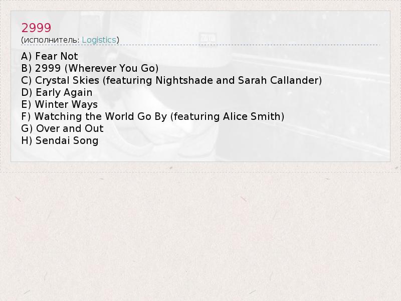 Это интересно:Logistics это британский драм-н-бэйс диджей, Matt Gresham, брат Dan Gresham (ака Nu:Tone) который дебютировал в марте 2004 с его первым релизом под названием "Replay".Он навсегда изменил направление drum-n-bass жанра, привнеся свое совершенно новое и уникальное звучание – смесь техно, электро и Джаз музыки в ломаном каркасе.Музыкальный вкус Logistics формировался под действием равно как гитарной музыки Rage... продолжение