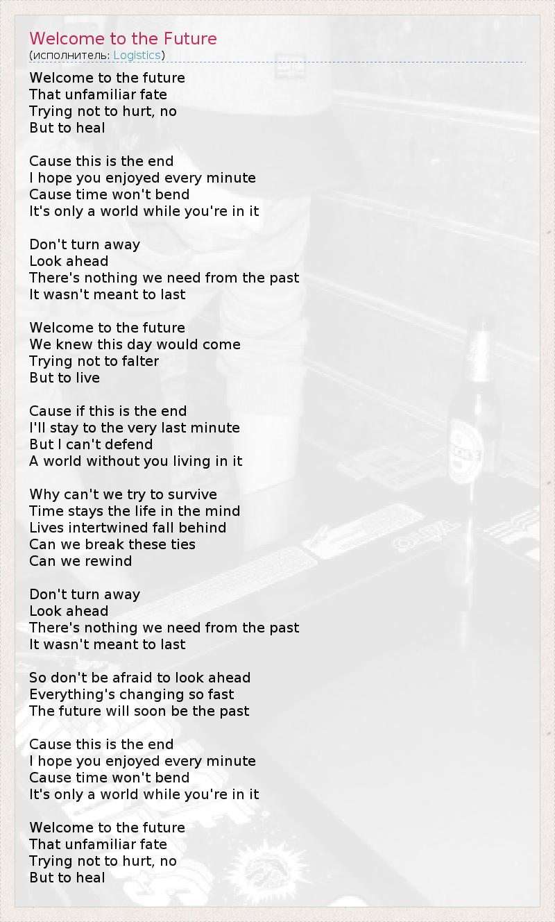 Добро пожаловать в будущее! Этот непривычный жребий Старается не ранить тебя, нет, Но вылечить. Потому что это - конец, Надеюсь, ты наслаждалась каждой минутой, Потому что время не сделает петлю, Это всего лишь мир, пока ты в нем живешь. Не отворачивайся, Смотри вперед - Там нет ничего, что бы нам было нужно от прошлого, Ему не суждено было длиться долго. Добро пожаловать в будущее! Мы знали, что этот день придет, Стараясь не колебаться, Но жить. Потому что если это - конец, Я останусь до самой последней минуты, Но я не могу защитить Мир без тебя, живущей в нем. Почему мы не можем попытаться выжить? Со временем "жизнь" становится простым воспоминанием. Жизни переплетаются, замедляясь. Можно ли разорвать эти связи, Можем ли мы перемотать? Не отворачивайся, Смотри вперед - Там нет ничего, что бы нам было нужно от прошлого, Ему не суждено было длиться долго. Так что не бойся смотреть в будущее, Все меняется так быстро, И будущее скоро станет прошлым. Потому что это - конец, Надеюсь, ты наслаждалась каждой минутой, Потому что время не сделает петлю, Это всего лишь мир, пока ты в нем живешь. Добро пожаловать в будущее! Этот непривычный жребий Старается не ранить тебя, нет, Но вылечить.