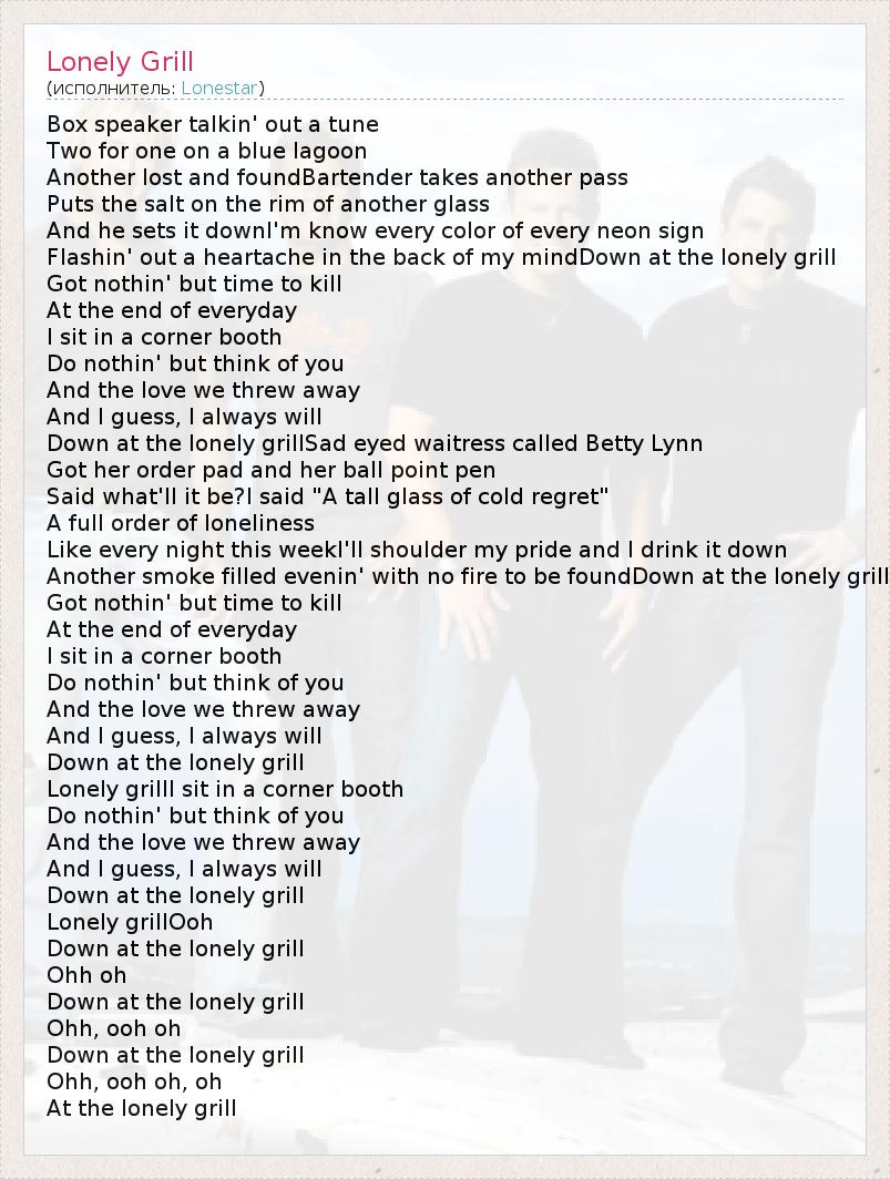 Box speaker talkin' out a tune Two for one on a blue lagoon Another lost and foundBartender takes another pass Puts the salt on the rim of another glass And he sets it downI'm know every color of every neon sign Flashin' out a heartache in the back of my mindDown at the lonely grill Got nothin' but time to kill At the end of everyday I sit in a corner booth Do nothin' but think of you And the love we threw away And I guess, I always will Down at the lonely grillSad eyed waitress called Betty Lynn Got her order pad and her ball point pen Said what'll it be?I said "A tall glass of cold regret" A full order of loneliness Like every night this weekI'll shoulder my pride and I drink it down Another smoke filled evenin' with no fire to be foundDown at the lonely grill Got nothin' but time to kill At the end of everyday I sit in a corner booth Do nothin' but think of you And the love we threw away And I guess, I always will Down at the lonely grill Lonely grillI sit in a corner booth Do nothin' but think of you And the love we threw away And I guess, I always will Down at the lonely grill Lonely grillOoh Down at the lonely grill Ohh oh Down at the lonely grill Ohh, ooh oh Down at the lonely grill Ohh, ooh oh, oh At the lonely grill