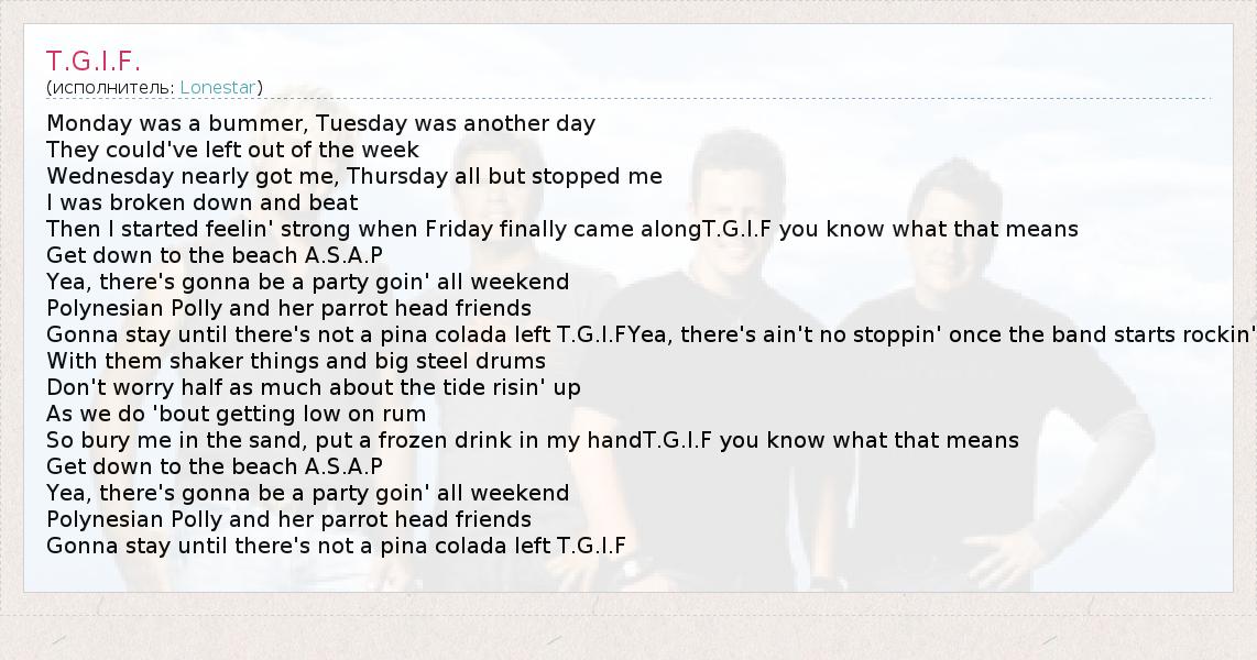 So bury me in the sand, put a frozen drink in my handT.G.I.F you know what that means
