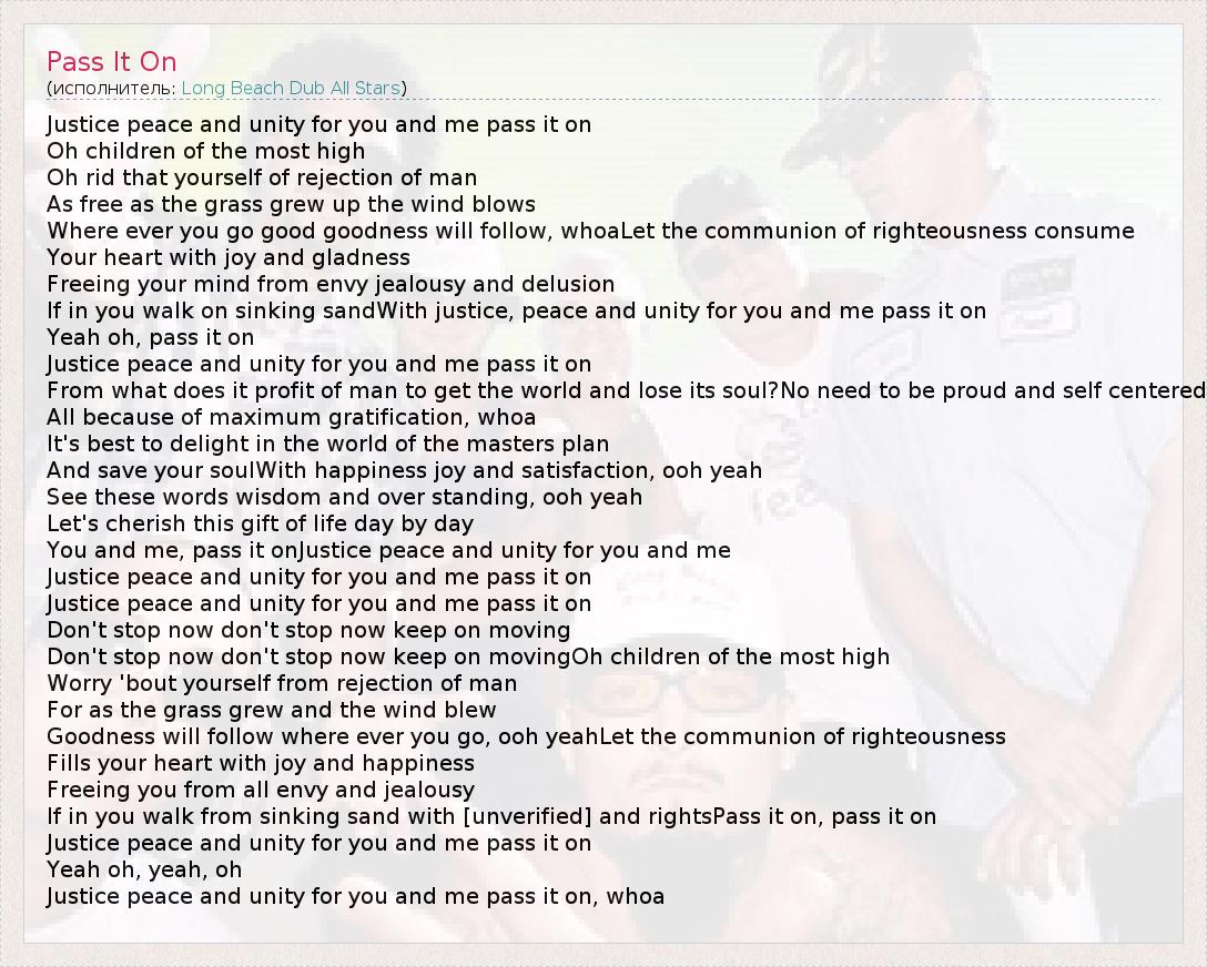 Justice peace and unity for you and me pass it on Oh children of the most high Oh rid that yourself of rejection of man As free as the grass grew up the wind blows Where ever you go good goodness will follow, whoaLet the communion of righteousness consume Your heart with joy and gladness Freeing your mind from envy jealousy and delusion If in you walk on sinking sandWith justice, peace and unity for you and me pass it on Yeah oh, pass it on Justice peace and unity for you and me pass it on From what does it profit of man to get the world and lose its soul?No need to be proud and self centered All because of maximum gratification, whoa It's best to delight in the world of the masters plan And save your soulWith happiness joy and satisfaction, ooh yeah See these words wisdom and over standing, ooh yeah Let's cherish this gift of life day by day You and me, pass it onJustice peace and unity for you and me Justice peace and unity for you and me pass it on Justice peace and unity for you and me pass it on Don't stop now don't stop now keep on moving Don't stop now don't stop now keep on movingOh children of the most high Worry 'bout yourself from rejection of man For as the grass grew and the wind blew Goodness will follow where ever you go, ooh yeahLet the communion of righteousness Fills your heart with joy and happiness Freeing you from all envy and jealousy If in you walk from sinking sand with [unverified] and rightsPass it on, pass it on Justice peace and unity for you and me pass it on Yeah oh, yeah, oh Justice peace and unity for you and me pass it on, whoa