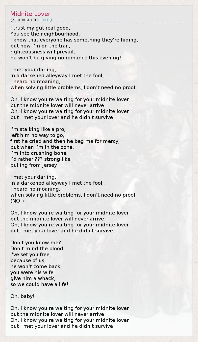 I trust my gut real good, You see the neighbourhood, I know that everyone has something they're hiding, but now I'm on the trail, righteousness will prevail, he won't be giving no romance this evening! I met your darling, In a darkened alleyway I met the fool, I heard no moaning, when solving little problems, I don't need no proof Oh, I know you're waiting for your midnite lover but the midnite lover will never arrive Oh, I know you're waiting for your midnite lover but I met your lover and he didn't survive I'm stalking like a pro, left him no way to go, first he cried and then he beg me for mercy, but when I'm in the zone, I'm into crushing bone, I'd rather ??? strong like pulling from jersey I met your darling, In a darkened alleyway I met the fool, I heard no moaning, when solving little problems, I don't need no proof (NO!) Oh, I know you're waiting for your midnite lover but the midnite lover will never arrive Oh, I know you're waiting for your midnite lover but I met your lover and he didn't survive Don't you know me? Don't mind the blood. I've set you free, because of us, he won't come back, you were his wife, give him a whack, so we could have a life! Oh, baby! Oh, I know you're waiting for your midnite lover but the midnite lover will never arrive Oh, I know you're waiting for your midnite lover but I met your lover and he didn't survive