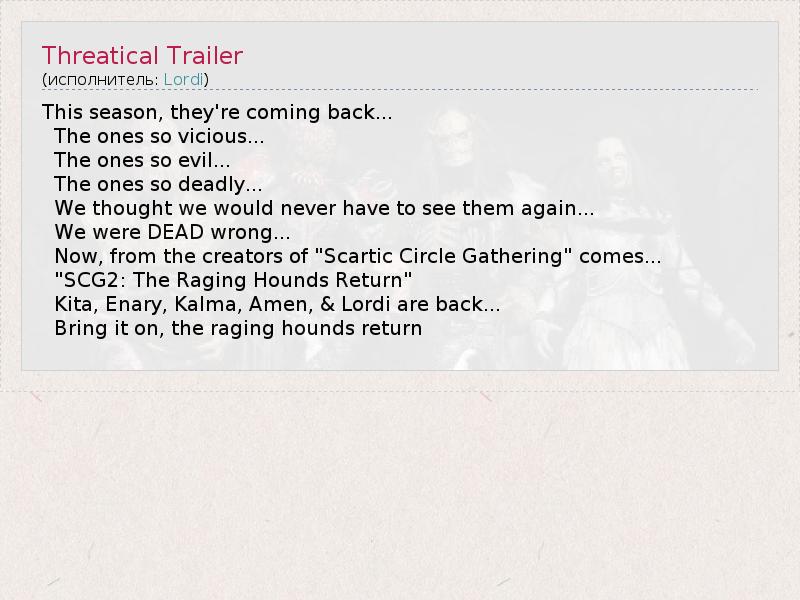 А как ты думаешь, о чем песня "Threatical Trailer" ?