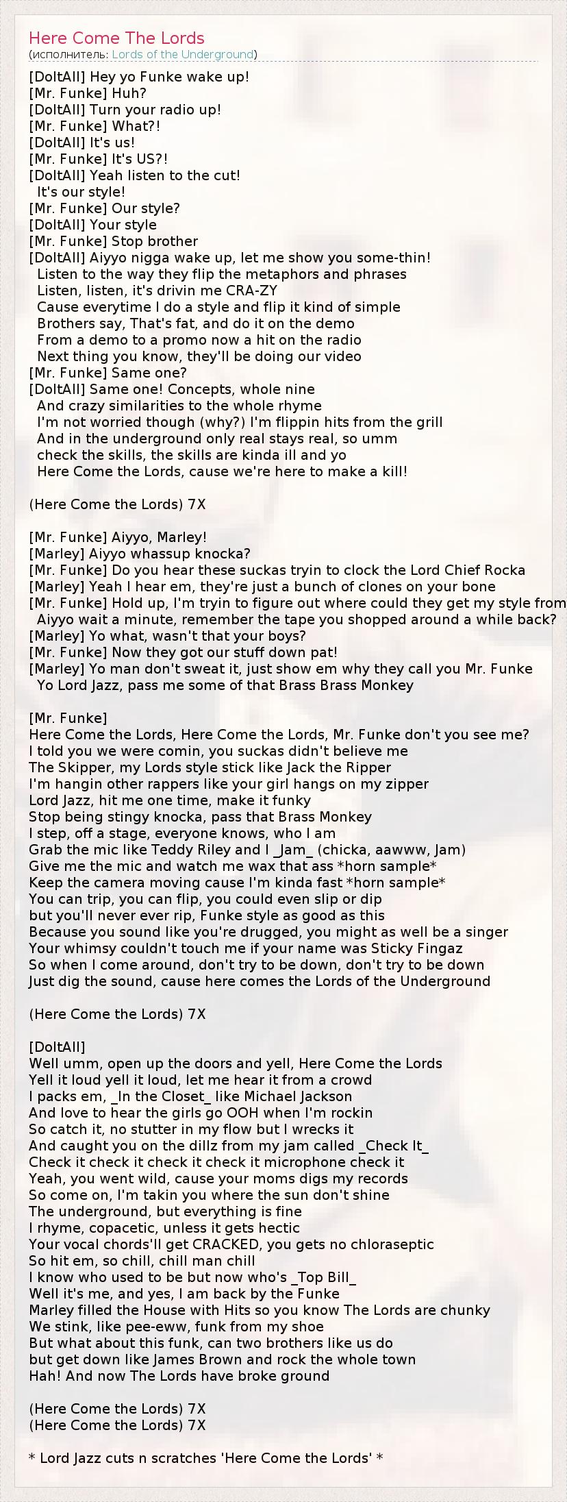 Это интересно:В девяностых годах хип-хоп начал подвергаться повсеместной популяризации. Многие стали видеть в нем способ легкой добычи денег. Когда же все решили, что было безопасно ставить на поток лишенные всякого смысла треки, раздался гром, земля затряслась, треснул асфальт, и… появились они, Lords Of The Underground (Боги Андеграунда), затмив никчемное творчество лживых эмси ярким фанком и ироничной лирикой.... продолжение