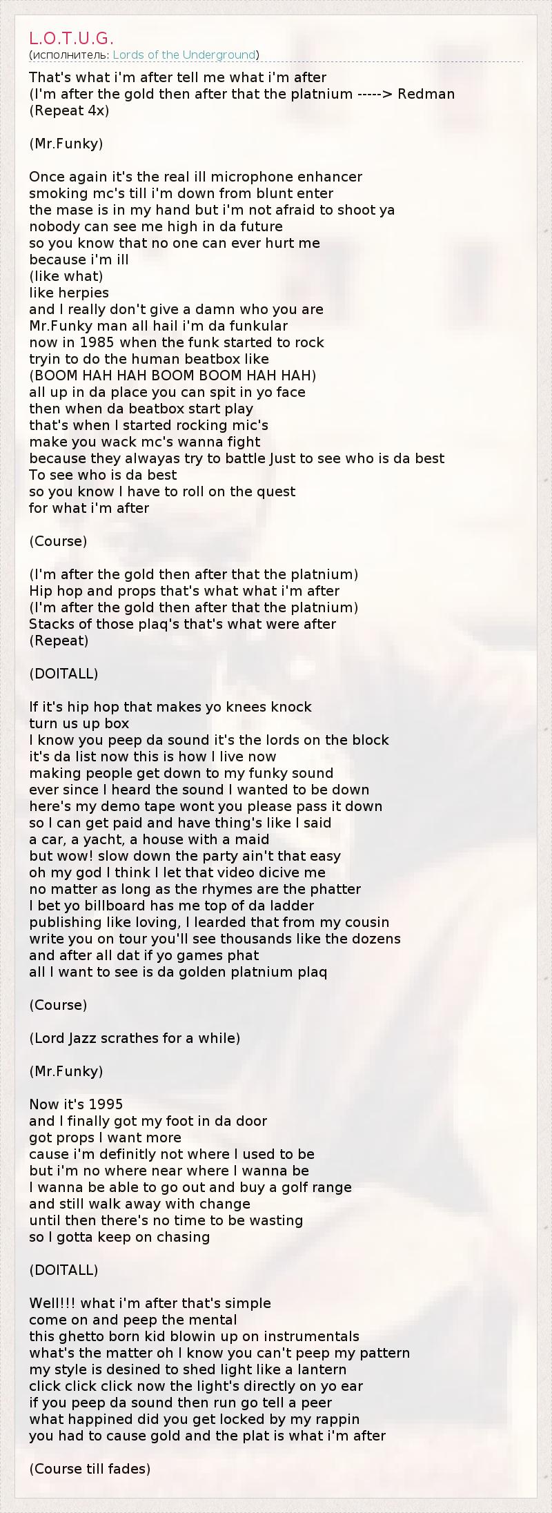 Это интересно:В девяностых годах хип-хоп начал подвергаться повсеместной популяризации. Многие стали видеть в нем способ легкой добычи денег. Когда же все решили, что было безопасно ставить на поток лишенные всякого смысла треки, раздался гром, земля затряслась, треснул асфальт, и… появились они, Lords Of The Underground (Боги Андеграунда), затмив никчемное творчество лживых эмси ярким фанком и ироничной лирикой.... продолжение