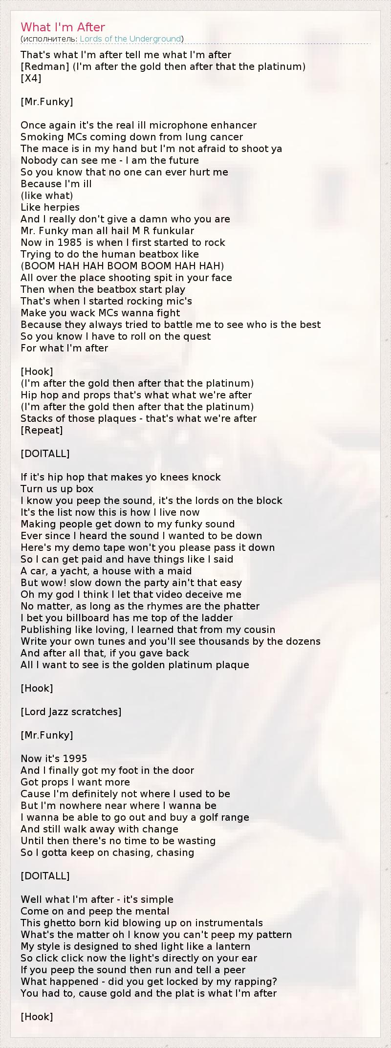 Это интересно:В девяностых годах хип-хоп начал подвергаться повсеместной популяризации. Многие стали видеть в нем способ легкой добычи денег. Когда же все решили, что было безопасно ставить на поток лишенные всякого смысла треки, раздался гром, земля затряслась, треснул асфальт, и… появились они, Lords Of The Underground (Боги Андеграунда), затмив никчемное творчество лживых эмси ярким фанком и ироничной лирикой.... продолжение