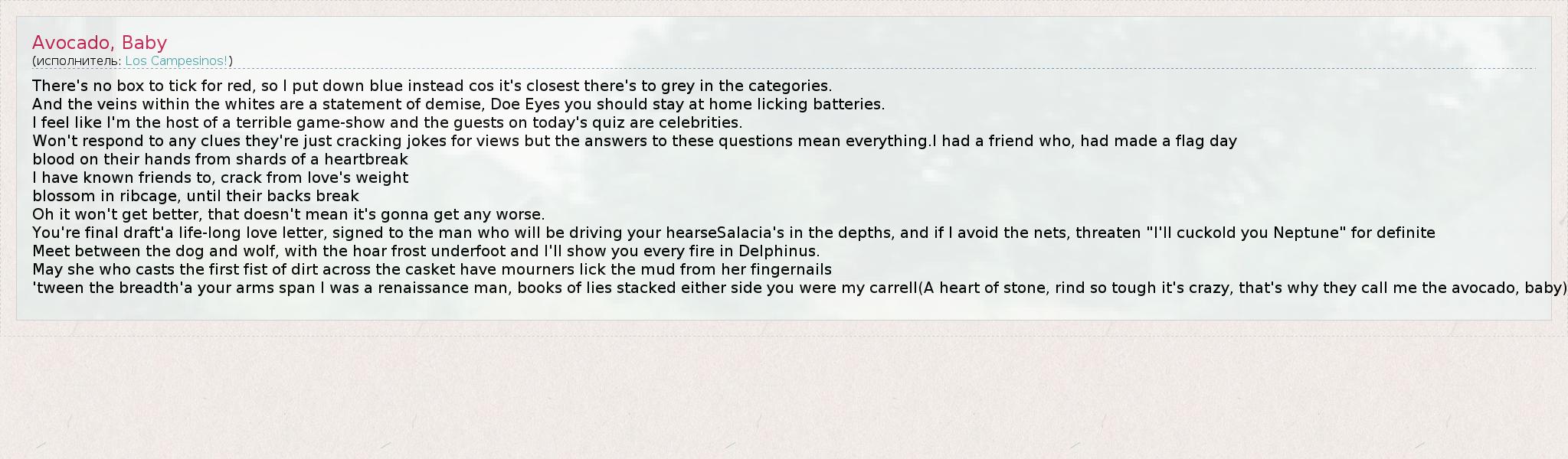 There's no box to tick for red, so I put down blue instead cos it's closest there's to grey in the categories. And the veins within the whites are a statement of demise, Doe Eyes you should stay at home licking batteries. I feel like I'm the host of a terrible game-show and the guests on today's quiz are celebrities. Won't respond to any clues they're just cracking jokes for views but the answers to these questions mean everything.I had a friend who, had made a flag day blood on their hands from shards of a heartbreak I have known friends to, crack from love's weight blossom in ribcage, until their backs break Oh it won't get better, that doesn't mean it's gonna get any worse. You're final draft'a life-long love letter, signed to the man who will be driving your hearseSalacia's in the depths, and if I avoid the nets, threaten "I'll cuckold you Neptune" for definite Meet between the dog and wolf, with the hoar frost underfoot and I'll show you every fire in Delphinus. May she who casts the first fist of dirt across the casket have mourners lick the mud from her fingernails 'tween the breadth'a your arms span I was a renaissance man, books of lies stacked either side you were my carrell(A heart of stone, rind so tough it's crazy, that's why they call me the avocado, baby)