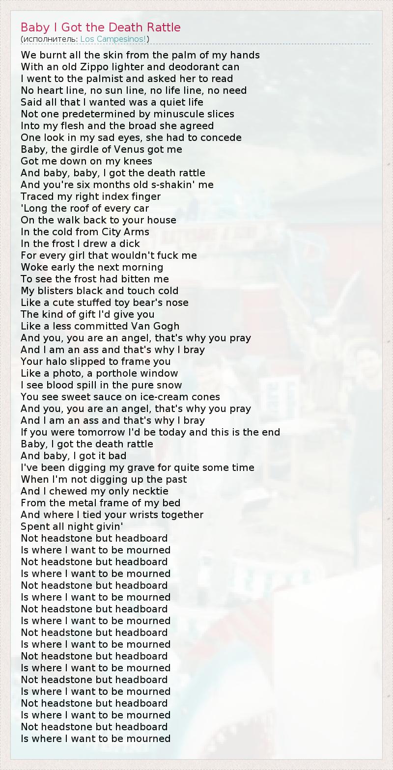 А как ты думаешь, о чем песня "Baby I Got the Death Rattle" ?