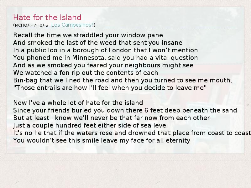 А как ты думаешь, о чем песня "Hate for the Island" ?