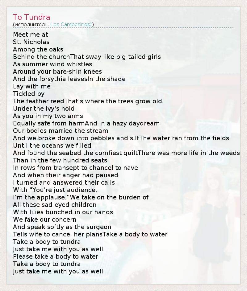 Meet me at St. Nicholas Among the oaks Behind the churchThat sway like pig-tailed girls As summer wind whistles Around your bare-shin knees And the forsythia leavesIn the shade Lay with me Tickled by The feather reedThat's where the trees grow old Under the ivy's hold As you in my two arms Equally safe from harmAnd in a hazy daydream Our bodies married the stream And we broke down into pebbles and siltThe water ran from the fields Until the oceans we filled And found the seabed the comfiest quiltThere was more life in the weeds Than in the few hundred seats In rows from transept to chancel to nave And when their anger had paused I turned and answered their calls With "You're just audience, I'm the applause."We take on the burden of All these sad-eyed children With lilies bunched in our hands We fake our concern And speak softly as the surgeon Tells wife to cancel her plansTake a body to water Take a body to tundra Just take me with you as well Please take a body to water Take a body to tundra Just take me with you as well