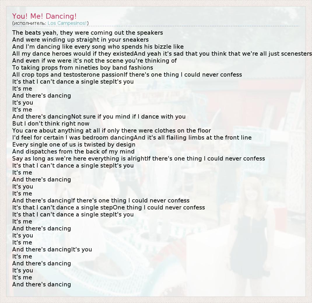 The beats yeah, they were coming out the speakers And were winding up straight in your sneakers And I'm dancing like every song who spends his bizzle like All my dance heroes would if they existedAnd yeah it's sad that you think that we're all just scenesters And even if we were it's not the scene you're thinking of To taking props from nineties boy band fashions All crop tops and testosterone passionIf there's one thing I could never confess It's that I can't dance a single stepIt's you It's me And there's dancing It's you It's me And there's dancingNot sure if you mind if I dance with you But I don't think right now You care about anything at all if only there were clothes on the floor I'd feel for certain I was bedroom dancingAnd it's all flailing limbs at the front line Every single one of us is twisted by design And dispatches from the back of my mind Say as long as we're here everything is alrightIf there's one thing I could never confess It's that I can't dance a single stepIt's you It's me And there's dancing It's you It's me And there's dancingIf there's one thing I could never confess It's that I can't dance a single stepOne thing I could never confess It's that I can't dance a single stepIt's you It's me And there's dancing It's you It's me And there's dancingIt's you It's me And there's dancing It's you It's me And there's dancing