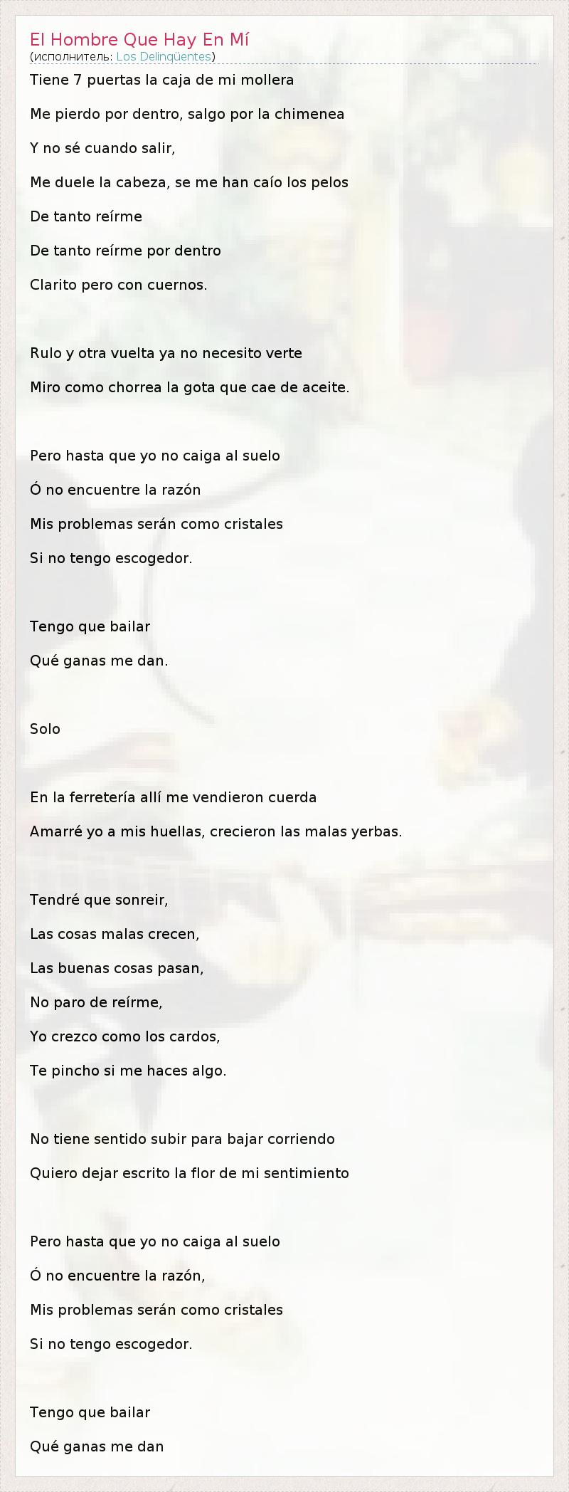 Tiene 7 puertas la caja de mi mollera Me pierdo por dentro, salgo por la chimenea Y no sé cuando salir, Me duele la cabeza, se me han caío los pelos De tanto reírme De tanto reírme por dentro Clarito pero con cuernos. Rulo y otra vuelta ya no necesito verte Miro como chorrea la gota que cae de aceite. Pero hasta que yo no caiga al suelo Ó no encuentre la razón Mis problemas serán como cristales Si no tengo escogedor. Tengo que bailar Qué ganas me dan. Solo En la ferretería allí me vendieron cuerda Amarré yo a mis huellas, crecieron las malas yerbas. Tendré que sonreir, Las cosas malas crecen, Las buenas cosas pasan, No paro de reírme, Yo crezco como los cardos, Te pincho si me haces algo. No tiene sentido subir para bajar corriendo Quiero dejar escrito la flor de mi sentimiento Pero hasta que yo no caiga al suelo Ó no encuentre la razón, Mis problemas serán como cristales Si no tengo escogedor. Tengo que bailar Qué ganas me dan
