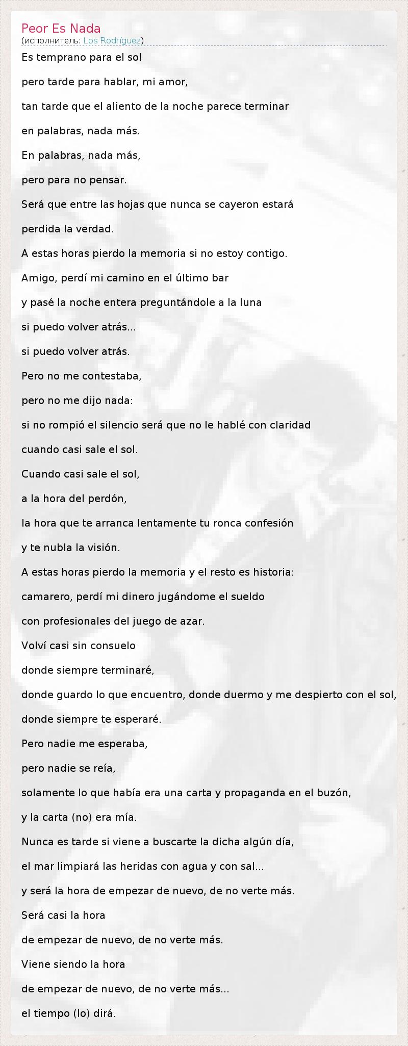 Это интересно:Los Rodríguez - группа, образованная в 1990, когда к Ариелю Роту (Ariel Rot) и Хулиану Инфанте(Julián Infante) (испанцы, члены группы Tequila) присоединились Андрес Каламаро (Andrés Calamaro из Los Abuelos de la Nada) и Херман Виледжа (Germán Vilella) - аргентинцы. Они начинали с "турне" по небольшим клубам Мадрида. В 1991 вышел их первый альбом "Buena Suerte". Песня-кавер на Фабиану Кантильо "Mi Enfermedad" ("Моя болезнь")... продолжение