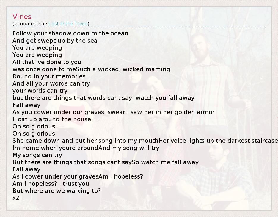 Это интересно:Lost in the Trees - американская оркестровая поп-фолк группа из Чапел-Хилл, штат Северная Каролина. В настоящее время они записываются на лейблах Trekky Records и ANTI-Records. В состав входят: Ари Пикер (лирика / вокал), Эмма Нодеау (валторна / вокал), Дрю Анагност (виолончель), Дженавьиев Варга (скрипка) и Марк Дуамен (туба). Вокалист Ари Пикер цитирует разнообразные влияния, таких музыкантов как Бетховен, Radiohead,... продолжение