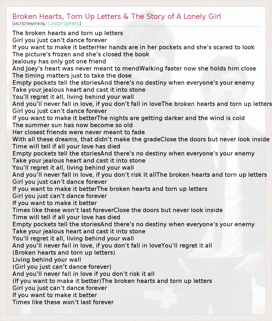 А как ты думаешь, о чем песня "Broken Hearts, Torn Up Letters & The Story of A Lonely Girl" ?