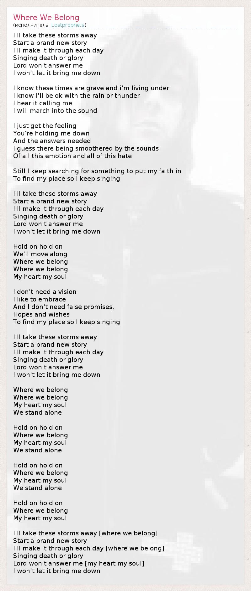 I'll take these storms away Start a brand new story I'll make it through each day Singing death or glory Lord won't answer me I won't let it bring me down I know these times are grave and i'm living under I know I'll be ok with the rain or thunder I hear it calling me I will march into the sound I just get the feeling You're holding me down And the answers needed I guess there being smoothered by the sounds Of all this emotion and all of this hate Still I keep searching for something to put my faith in To find my place so I keep singing I'll take these storms away Start a brand new story I'll make it through each day Singing death or glory Lord won't answer me I won't let it bring me down Hold on hold on We'll move along Where we belong Where we belong My heart my soul I don't need a vision I like to embrace And I don't need false promises, Hopes and wishes To find my place so I keep singing I'll take these storms away Start a brand new story I'll make it through each day Singing death or glory Lord won't answer me I won't let it bring me down Where we belong Where we belong My heart my soul We stand alone Hold on hold on Where we belong My heart my soul We stand alone Hold on hold on Where we belong My heart my soul We stand alone Hold on hold on Where we belong My heart my soul I'll take these storms away [where we belong] Start a brand new story I'll make it through each day [where we belong] Singing death or glory Lord won't answer me [my heart my soul] I won't let it bring me down