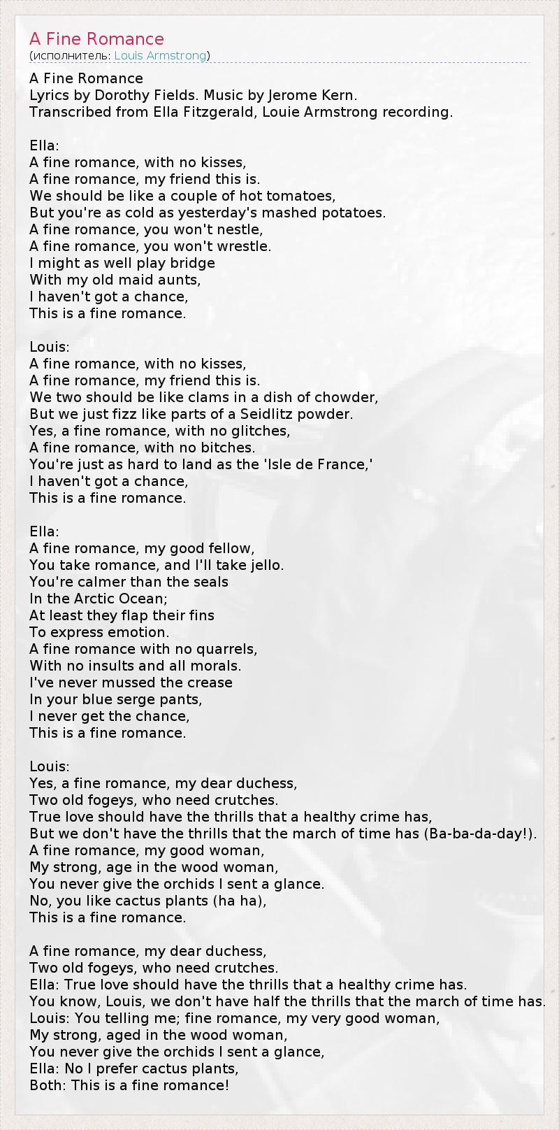 A Fine Romance Lyrics by Dorothy Fields. Music by Jerome Kern. Transcribed from Ella Fitzgerald, Louie Armstrong recording. Ella: A fine romance, with no kisses, A fine romance, my friend this is. We should be like a couple of hot tomatoes, But you're as cold as yesterday's mashed potatoes. A fine romance, you won't nestle, A fine romance, you won't wrestle. I might as well play bridge With my old maid aunts, I haven't got a chance, This is a fine romance. Louis: A fine romance, with no kisses, A fine romance, my friend this is. We two should be like clams in a dish of chowder, But we just fizz like parts of a Seidlitz powder. Yes, a fine romance, with no glitches, A fine romance, with no bitches. You're just as hard to land as the 'Isle de France,' I haven't got a chance, This is a fine romance. Ella: A fine romance, my good fellow, You take romance, and I'll take jello. You're calmer than the seals In the Arctic Ocean; At least they flap their fins To express emotion. A fine romance with no quarrels, With no insults and all morals. I've never mussed the crease In your blue serge pants, I never get the chance, This is a fine romance. Louis: Yes, a fine romance, my dear duchess, Two old fogeys, who need crutches. True love should have the thrills that a healthy crime has, But we don't have the thrills that the march of time has (Ba-ba-da-day!). A fine romance, my good woman, My strong, age in the wood woman, You never give the orchids I sent a glance. No, you like cactus plants (ha ha), This is a fine romance. A fine romance, my dear duchess, Two old fogeys, who need crutches. Ella: True love should have the thrills that a healthy crime has. You know, Louis, we don't have half the thrills that the march of time has. Louis: You telling me; fine romance, my very good woman, My strong, aged in the wood woman, You never give the orchids I sent a glance, Ella: No I prefer cactus plants, Both: This is a fine romance!