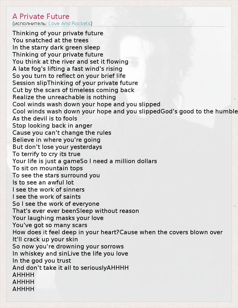 Thinking of your private future You snatched at the trees In the starry dark green sleep Thinking of your private future You think at the river and set it flowing A late fog's lifting a fast wind's rising So you turn to reflect on your brief life Session slipThinking of your private future Cut by the scars of timeless coming back Realize the unreachable is nothing Cool winds wash down your hope and you slipped Cool winds wash down your hope and you slippedGod's good to the humble As the devil is to fools Stop looking back in anger Cause you can't change the rules Believe in where you're going But don't lose your yesterdays To terrify to cry its true Your life is just a gameSo I need a million dollars To sit on mountain tops To see the stars surround you Is to see an awful lot I see the work of sinners I see the work of saints So I see the work of everyone That's ever ever beenSleep without reason Your laughing masks your love You've got so many scars How does it feel deep in your heart?Cause when the covers blown over It'll crack up your skin So now you're drowning your sorrows In whiskey and sinLive the life you love In the god you trust And don't take it all to seriouslyAHHHH AHHHH AHHHH AHHHH