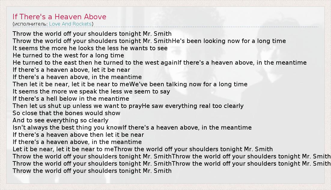 Throw the world off your shoulders tonight Mr. Smith Throw the world off your shoulders tonight Mr. SmithHe's been looking now for a long time It seems the more he looks the less he wants to see He turned to the west for a long time He turned to the east then he turned to the west againIf there's a heaven above, in the meantime If there's a heaven above, let it be near If there's a heaven above, in the meantime Then let it be near, let it be near to meWe've been talking now for a long time It seems the more we speak the less we seem to say If there's a hell below in the meantime Then let us shut up unless we want to prayHe saw everything real too clearly So close that the bones would show And to see everything so clearly Isn't always the best thing you knowIf there's a heaven above, in the meantime If there's a heaven above then let it be near If there's a heaven above, in the meantime Let it be near, let it be near to meThrow the world off your shoulders tonight Mr. Smith Throw the world off your shoulders tonight Mr. SmithThrow the world off your shoulders tonight Mr. Smith Throw the world off your shoulders tonight Mr. SmithThrow the world off your shoulders tonight Mr. Smith Throw the world off your shoulders tonight Mr. Smith