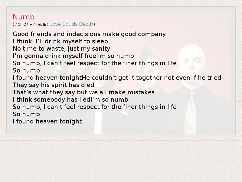 Good friends and indecisions make good company I think, I'll drink myself to sleep No time to waste, just my sanity I'm gonna drink myself freeI'm so numb So numb, I can't feel respect for the finer things in life So numb I found heaven tonightHe couldn't get it together not even if he tried They say his spirit has died That's what they say but we all make mistakes I think somebody has liedI'm so numb So numb, I can't feel respect for the finer things in life So numb I found heaven tonight
