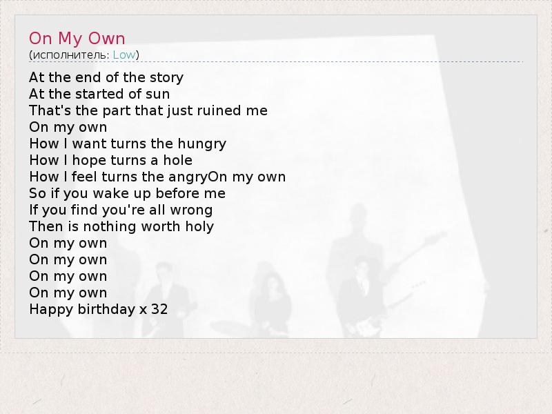 At the end of the story At the started of sun That's the part that just ruined me On my own How I want turns the hungry How I hope turns a hole How I feel turns the angryOn my own So if you wake up before me If you find you're all wrong Then is nothing worth holy On my own On my own On my own On my own Happy birthday x 32