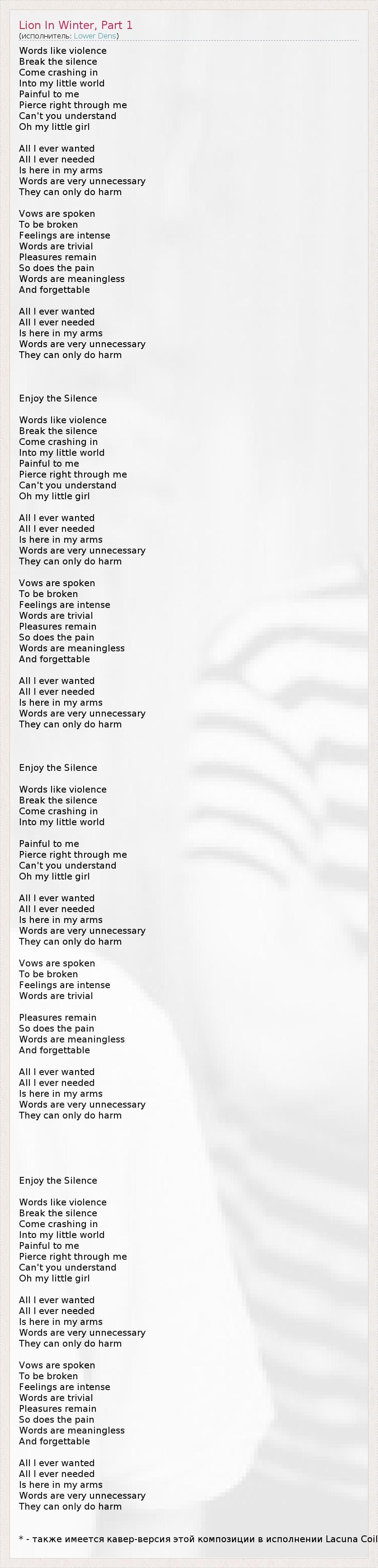 Words like violence Break the silence Come crashing in Into my little world Painful to me Pierce right through me Can't you understand Oh my little girl All I ever wanted All I ever needed Is here in my arms Words are very unnecessary They can only do harm Vows are spoken To be broken Feelings are intense Words are trivial Pleasures remain So does the pain Words are meaningless And forgettable All I ever wanted All I ever needed Is here in my arms Words are very unnecessary They can only do harm Enjoy the Silence Words like violence Break the silence Come crashing in Into my little world Painful to me Pierce right through me Can't you understand Oh my little girl All I ever wanted All I ever needed Is here in my arms Words are very unnecessary They can only do harm Vows are spoken To be broken Feelings are intense Words are trivial Pleasures remain So does the pain Words are meaningless And forgettable All I ever wanted All I ever needed Is here in my arms Words are very unnecessary They can only do harm Enjoy the Silence Words like violence Break the silence Come crashing in Into my little world Painful to me Pierce right through me Can't you understand Oh my little girl All I ever wanted All I ever needed Is here in my arms Words are very unnecessary They can only do harm Vows are spoken To be broken Feelings are intense Words are trivial Pleasures remain So does the pain Words are meaningless And forgettable All I ever wanted All I ever needed Is here in my arms Words are very unnecessary They can only do harm Enjoy the Silence Words like violence Break the silence Come crashing in Into my little world Painful to me Pierce right through me Can't you understand Oh my little girl All I ever wanted All I ever needed Is here in my arms Words are very unnecessary They can only do harm Vows are spoken To be broken Feelings are intense Words are trivial Pleasures remain So does the pain Words are meaningless And forgettable All I ever wanted All I ever needed Is here in my arms Words are very unnecessary They can only do harm * - также имеется кавер-версия этой композиции в исполнении Lacuna Coil