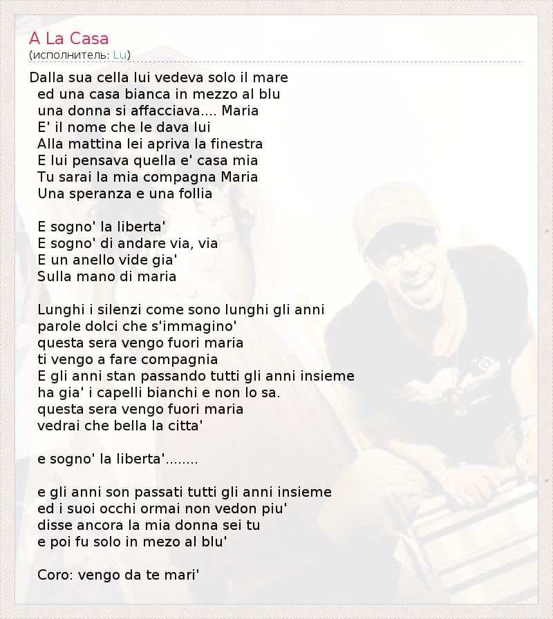 Dalla sua cella lui vedeva solo il mare ed una casa bianca in mezzo al blu una donna si affacciava.... Maria E' il nome che le dava lui Alla mattina lei apriva la finestra E lui pensava quella e' casa mia Tu sarai la mia compagna Maria Una speranza e una follia E sogno' la liberta' E sogno' di andare via, via E un anello vide gia' Sulla mano di maria Lunghi i silenzi come sono lunghi gli anni parole dolci che s'immagino' questa sera vengo fuori maria ti vengo a fare compagnia E gli anni stan passando tutti gli anni insieme ha gia' i capelli bianchi e non lo sa. questa sera vengo fuori maria vedrai che bella la citta' e sogno' la liberta'........ e gli anni son passati tutti gli anni insieme ed i suoi occhi ormai non vedon piu' disse ancora la mia donna sei tu e poi fu solo in mezo al blu' Coro: vengo da te mari'