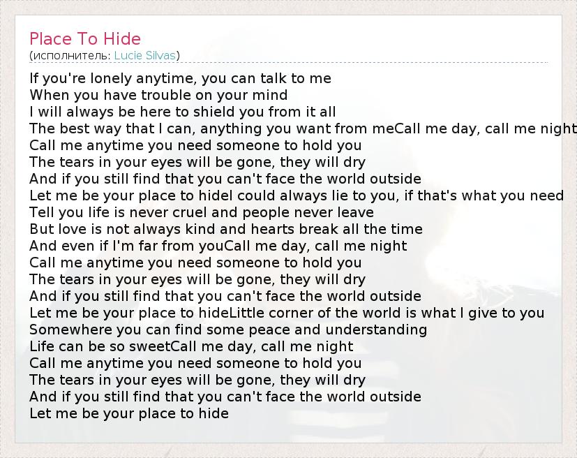 А как ты думаешь, о чем песня "Place To Hide" ?