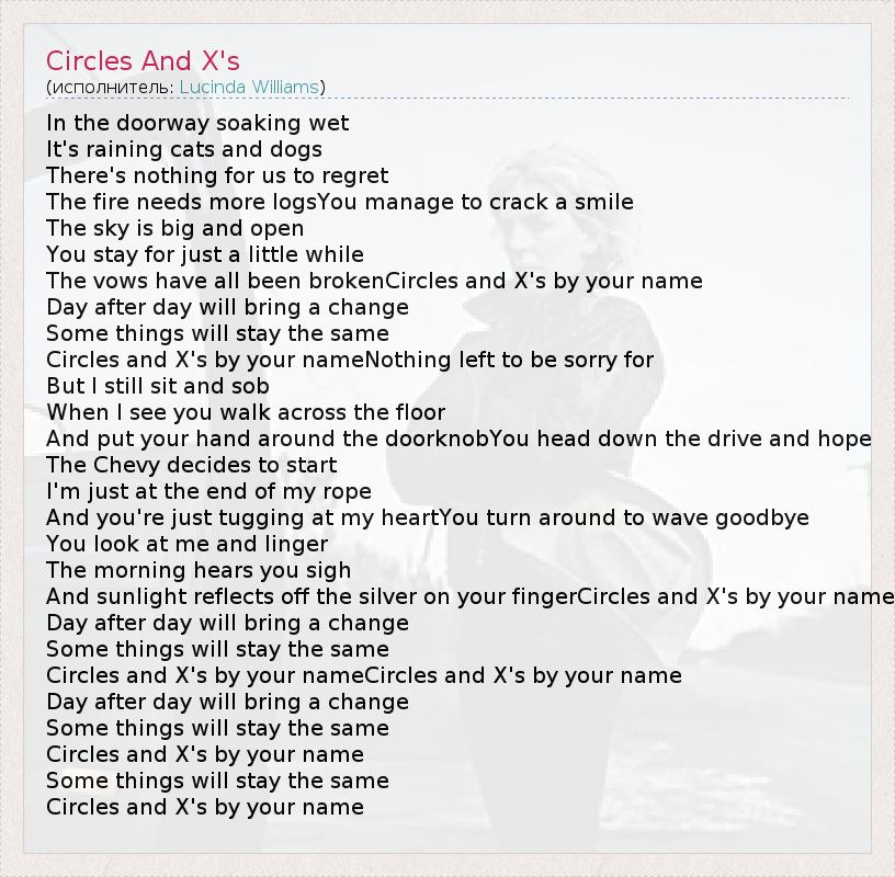 In the doorway soaking wet It's raining cats and dogs There's nothing for us to regret The fire needs more logsYou manage to crack a smile The sky is big and open You stay for just a little while The vows have all been brokenCircles and X's by your name Day after day will bring a change Some things will stay the same Circles and X's by your nameNothing left to be sorry for But I still sit and sob When I see you walk across the floor And put your hand around the doorknobYou head down the drive and hope The Chevy decides to start I'm just at the end of my rope And you're just tugging at my heartYou turn around to wave goodbye You look at me and linger The morning hears you sigh And sunlight reflects off the silver on your fingerCircles and X's by your name Day after day will bring a change Some things will stay the same Circles and X's by your nameCircles and X's by your name Day after day will bring a change Some things will stay the same Circles and X's by your name Some things will stay the same Circles and X's by your name