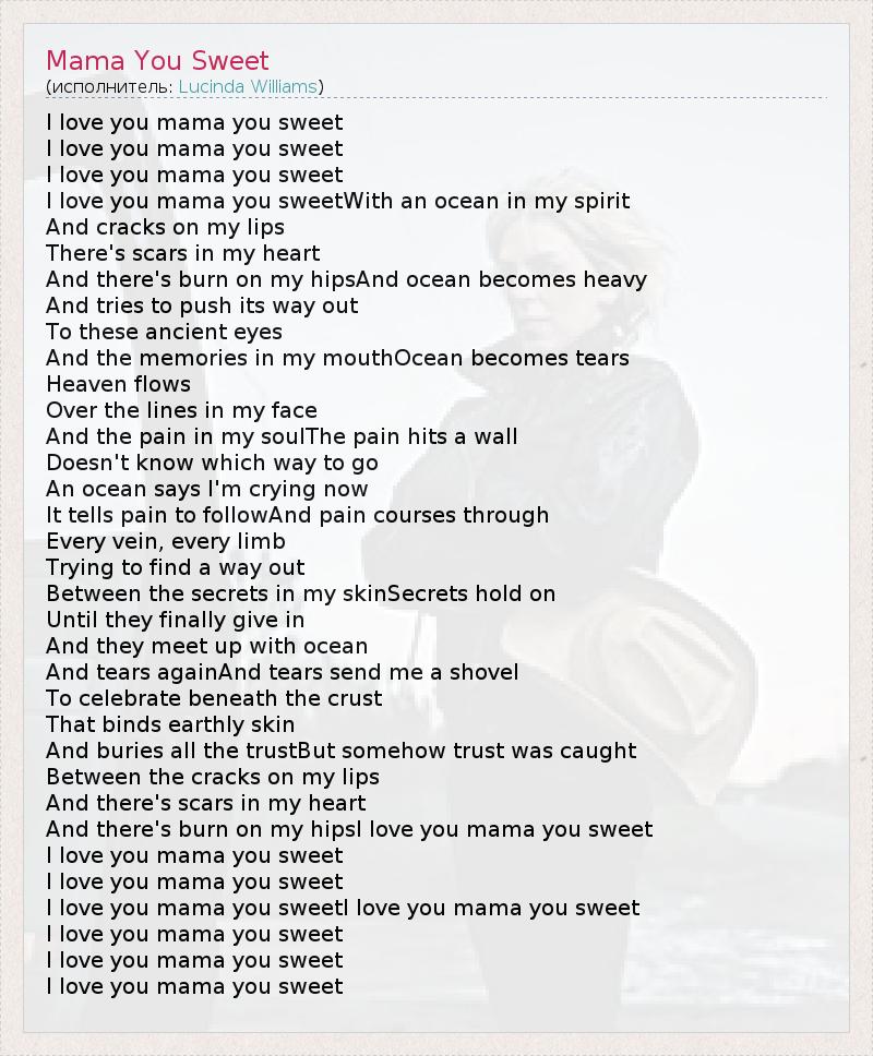 I love you mama you sweet I love you mama you sweet I love you mama you sweet I love you mama you sweetWith an ocean in my spirit And cracks on my lips There's scars in my heart And there's burn on my hipsAnd ocean becomes heavy And tries to push its way out To these ancient eyes And the memories in my mouthOcean becomes tears Heaven flows Over the lines in my face And the pain in my soulThe pain hits a wall Doesn't know which way to go An ocean says I'm crying now It tells pain to followAnd pain courses through Every vein, every limb Trying to find a way out Between the secrets in my skinSecrets hold on Until they finally give in And they meet up with ocean And tears againAnd tears send me a shovel To celebrate beneath the crust That binds earthly skin And buries all the trustBut somehow trust was caught Between the cracks on my lips And there's scars in my heart And there's burn on my hipsI love you mama you sweet I love you mama you sweet I love you mama you sweet I love you mama you sweetI love you mama you sweet I love you mama you sweet I love you mama you sweet I love you mama you sweet