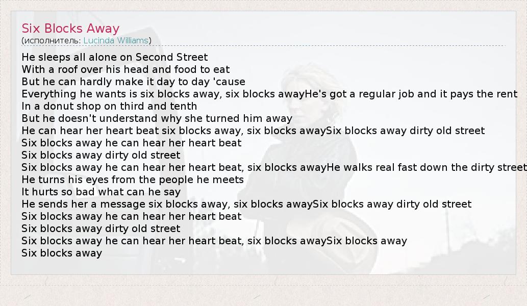 He sleeps all alone on Second Street With a roof over his head and food to eat But he can hardly make it day to day 'cause Everything he wants is six blocks away, six blocks awayHe's got a regular job and it pays the rent In a donut shop on third and tenth But he doesn't understand why she turned him away He can hear her heart beat six blocks away, six blocks awaySix blocks away dirty old street Six blocks away he can hear her heart beat Six blocks away dirty old street Six blocks away he can hear her heart beat, six blocks awayHe walks real fast down the dirty street He turns his eyes from the people he meets It hurts so bad what can he say He sends her a message six blocks away, six blocks awaySix blocks away dirty old street Six blocks away he can hear her heart beat Six blocks away dirty old street Six blocks away he can hear her heart beat, six blocks awaySix blocks away Six blocks away