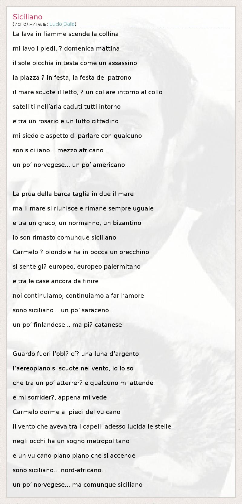 Это интересно:Лучо Далла родился 4 марта 1943 года. Кроме даты рождения Даллы эти цифры стали названием одного из его дисков, ставших классикой, более известного широкой публике под названием "Gesu' Bambino" («Младенец Иисус»). Фоном его творческого дебюта стала послевоенная Болонья, уже созревшая для того, чтобы увлечь Италию в эпоху индустриального подъема. Лучо - паренек из разряда неудачников, беспокойный,... продолжение