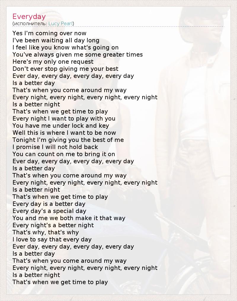 Yes I'm coming over now I've been waiting all day long I feel like you know what's going on You've always given me some greater times Here's my only one request Don't ever stop giving me your best Ever day, every day, every day, every day Is a better day That's when you come around my way Every night, every night, every night, every night Is a better night That's when we get time to play Every night I want to play with you You have me under lock and key Well this is where I want to be now Tonight I'm giving you the best of me I promise I will not hold back You can count on me to bring it on Ever day, every day, every day, every day Is a better day That's when you come around my way Every night, every night, every night, every night Is a better night That's when we get time to play Every day is a better day Every day's a special day You and me we both make it that way Every night's a better night That's why, that's why I love to say that every day Ever day, every day, every day, every day Is a better day That's when you come around my way Every night, every night, every night, every night Is a better night That's when we get time to play