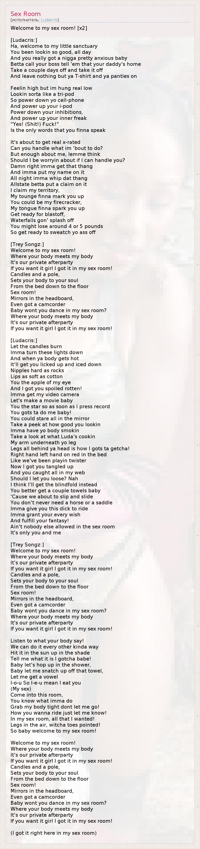 Welcome to my sex room! [x2] [Ludacris:] Ha, welcome to my little sanctuary You been lookin so good, all day And you really got a nigga pretty anxious baby Betta call your boss tell 'em that your daddy's home Take a couple days off and take it off And leave nothing but ya T-shirt and ya panties on Feelin high but im hung real low Lookin sorta like a tri-pod So power down yo cell-phone And power up your i-pod Power down your inhibitions, And power up your inner freak "Yes! (Shit!) Fuck!" Is the only words that you finna speak It's about to get real x-rated Can you handle what im 'bout to do? But enough about me, lemme think Should I be worryin about if I can handle you? Damn right imma get that thang And imma put my name on it All night imma whip dat thang Allstate betta put a claim on it I claim my territory, My tounge finna mark you up You could be my firecracker, My tongue finna spark you up Get ready for blastoff, Waterfalls gon' splash off You might lose around 4 or 5 pounds So get ready to sweatch yo ass off [Trey Songz:] Welcome to my sex room! Where your body meets my body It's our private afterparty If you want it girl I got it in my sex room! Candles and a pole, Sets your body to your soul From the bed down to the floor Sex room! Mirrors in the headboard, Even got a camcorder Baby wont you dance in my sex room? Where your body meets my body It's our private afterparty If you want it girl I got it in my sex room! [Ludacris:] Let the candles burn Imma turn these lights down And when ya body gets hot It'll get you licked up and iced down Nipples hard as rocks Lips as soft as cotton You the apple of my eye And I got you spoiled rotten! Imma get my video camera Let's make a movie baby You the star so as soon as I press record You gots ta do me baby! You could stare all in the mirror Take a peek at how good you lookin Imma have yo body smokin Take a look at what Luda's cookin My arm underneath yo leg Legs all behind ya head is how I gots ta getcha! Right hand left hand on red in the bed Like we've been playin twister Now I got you tangled up And you caught all in my web Should I let you loose? Nah I think I'll get the blindfold instead You better get a couple towels baby 'Cause we about to slip and slide You don't never need a horse or a saddle Imma give you this dick to ride Imma grant your every wish And fulfill your fantasy! Ain't nobody else allowed in the sex room It's only you and me [Trey Songz:] Welcome to my sex room! Where your body meets my body It's our private afterparty If you want it girl I got it in my sex room! Candles and a pole, Sets your body to your soul From the bed down to the floor Sex room! Mirrors in the headboard, Even got a camcorder Baby wont you dance in my sex room? Where your body meets my body It's our private afterparty If you want it girl I got it in my sex room! Listen to what your body say! We can do it every other kinda way Hit it in the sun up in the shade Tell me what it is I gotcha babe! Baby let's hop up in the shower, Baby let me snatch up off that towel, Let me get a vowel I-o-u So I-e-u mean I eat you (My sex) Come into this room, You know what imma do Grab my body tight dont let me go! How you wanna ride just let me know! In my sex room, all that I wanted! Legs in the air, witcha toes pointed! So baby welcome to my sex room! Welcome to my sex room! Where your body meets my body It's our private afterparty If you want it girl I got it in my sex room! Candles and a pole, Sets your body to your soul From the bed down to the floor Sex room! Mirrors in the headboard, Even got a camcorder Baby wont you dance in my sex room? Where your body meets my body It's our private afterparty If you want it girl I got it in my sex room! (I got it right here in my sex room)
