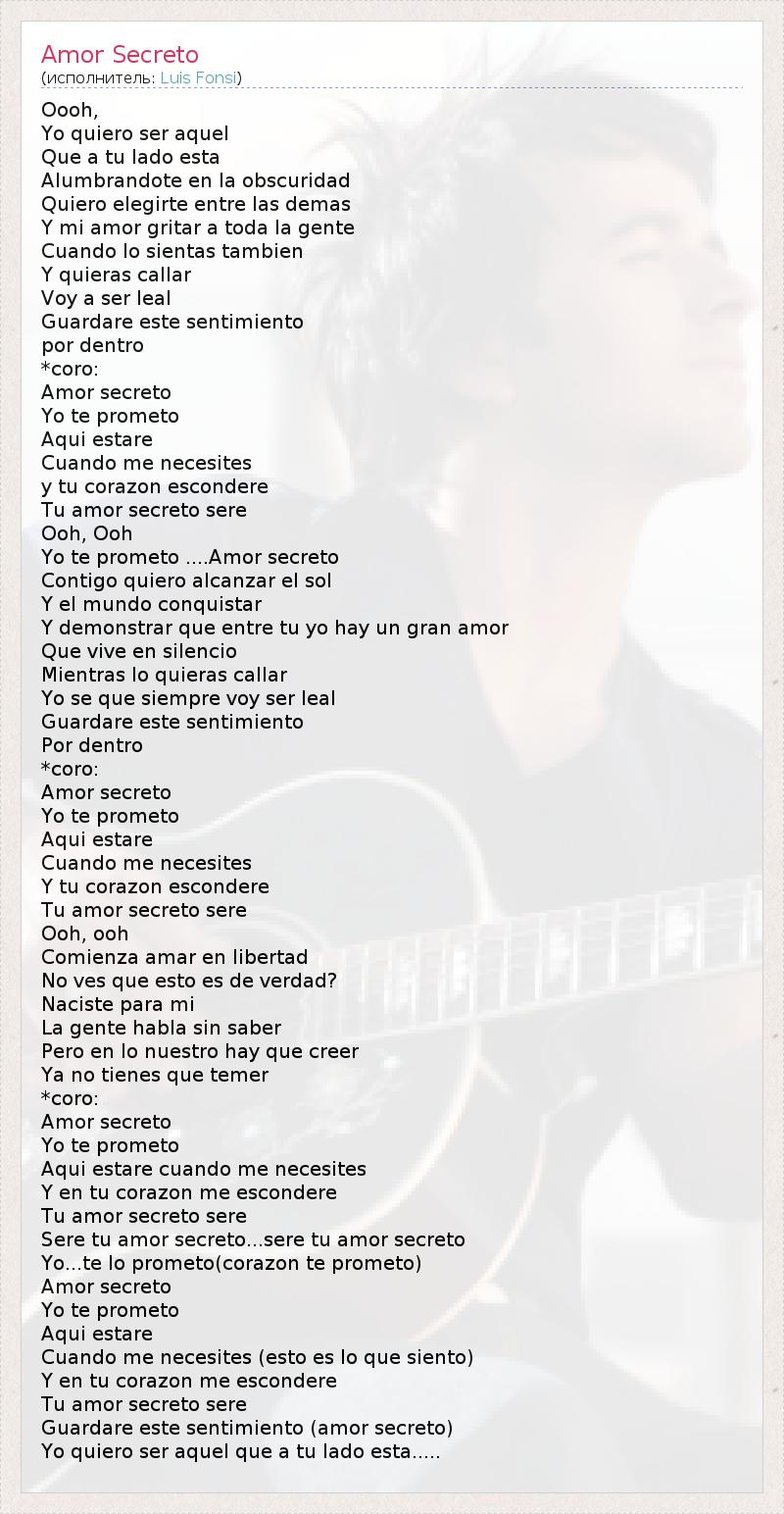 Ооо, Yo Quiero Ser AQUEL QueTu Ладо ЭСТА Alumbrandote En La obscuridad Quiero elegirte Entre -лас- Димас Y Mi Amor gritarТода ла Gente Cuando Ло sientas Tambien Y quieras Каллар Voyсер Лил Guardare Эсте Sentimiento POR Dentro * Коро : Amor Secreto Йо тэ prometo Aqui estare Cuando мне necesites у Ту Corazon escondere Ту Amor Secreto сере Ох, ох Йо тэ prometo .... Amor Secreto Солидарность Quiero alcanzar El Sol Y El Mundo conquistar Y demonstrar Que Entre Ту лет сено ООН Gran Amor Que Vive EN Silencio Mientras вот quieras Каллар Йо себе Que Siempre Voy сер Лил Guardare Эсте Sentimiento Por Dentro * Коро : Amor Secreto Йо тэ prometo Aqui estare Cuando мне necesites Y Tu Corazon escondere Ту Amor Secreto сере Ох , ох Comienza Амар ан -Либертад Нет VES Que Эсто эс -де- Verdad ? Naciste пара миль La Gente Habla грех сабля Перо ан вот Nuestro сено Que Creer Я не Tienes Que temer * Коро : Amor Secreto Йо тэ prometo Aqui estare Cuando мне necesites У ванной Ту Corazon мне escondere Ту Amor Secreto сере Сере Ту Amor Secreto ... сере Ту Amor Secreto Yo ... те вот prometo (Corazon те prometo ) Amor Secreto Йо тэ prometo Aqui estare Cuando мне necesites ( Эсто эс вот Que Siento ) У ванной Ту Corazon мне escondere Ту Amor Secreto сере Guardare Эсте Sentimiento ( Amor Secreto ) Yo Quiero Ser AQUEL QueTu Ладо ЭСТА .....