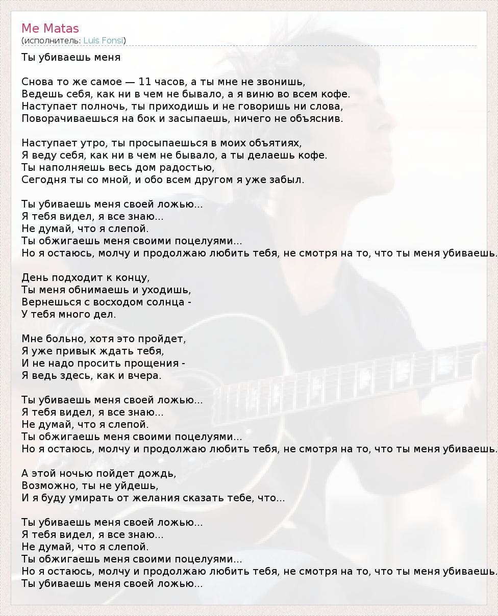 Ты убиваешь меня Снова то же самое — 11 часов, а ты мне не звонишь, Ведешь себя, как ни в чем не бывало, а я виню во всем кофе. Наступает полночь, ты приходишь и не говоришь ни слова, Поворачиваешься на бок и засыпаешь, ничего не объяснив. Наступает утро, ты просыпаешься в моих объятиях, Я веду себя, как ни в чем не бывало, а ты делаешь кофе. Ты наполняешь весь дом радостью, Сегодня ты со мной, и обо всем другом я уже забыл. Ты убиваешь меня своей ложью... Я тебя видел, я все знаю... Не думай, что я слепой. Ты обжигаешь меня своими поцелуями... Но я остаюсь, молчу и продолжаю любить тебя, не смотря на то, что ты меня убиваешь. День подходит к концу, Ты меня обнимаешь и уходишь, Вернешься с восходом солнца - У тебя много дел. Мне больно, хотя это пройдет, Я уже привык ждать тебя, И не надо просить прощения - Я ведь здесь, как и вчера. Ты убиваешь меня своей ложью... Я тебя видел, я все знаю... Не думай, что я слепой. Ты обжигаешь меня своими поцелуями... Но я остаюсь, молчу и продолжаю любить тебя, не смотря на то, что ты меня убиваешь. А этой ночью пойдет дождь, Возможно, ты не уйдешь, И я буду умирать от желания сказать тебе, что... Ты убиваешь меня своей ложью... Я тебя видел, я все знаю... Не думай, что я слепой. Ты обжигаешь меня своими поцелуями... Но я остаюсь, молчу и продолжаю любить тебя, не смотря на то, что ты меня убиваешь. Ты убиваешь меня своей ложью...
