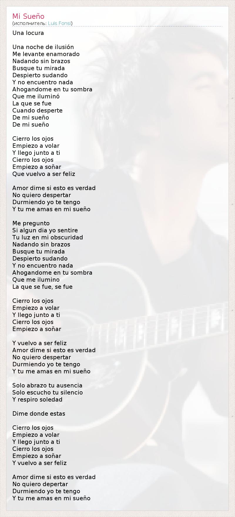 Una locura Una noche de ilusión Me levante enamorado Nadando sin brazos Busque tu mirada Despierto sudando Y no encuentro nada Ahogandome en tu sombra Que me iluminó La que se fue Cuando desperte De mi sueño De mi sueño Cierro los ojos Empiezo a volar Y llego junto a ti Cierro los ojos Empiezo a soñar Que vuelvo a ser feliz Amor dime si esto es verdad No quiero despertar Durmiendo yo te tengo Y tu me amas en mi sueño Me pregunto Si algun dia yo sentire Tu luz en mi obscuridad Nadando sin brazos Busque tu mirada Despierto sudando Y no encuentro nada Ahogandome en tu sombra Que me ilumino La que se fue, se fue Cierro los ojos Empiezo a volar Y llego junto a ti Cierro los ojos Empiezo a soñar Y vuelvo a ser feliz Amor dime si esto es verdad No quiero despertar Durmiendo yo te tengo Y tu me amas en mi sueño Solo abrazo tu ausencia Solo escucho tu silencio Y respiro soledad Dime donde estas Cierro los ojos Empiezo a volar Y llego junto a ti Cierro los ojos Empiezo a soñar Y vuelvo a ser feliz Amor dime si esto es verdad No quiero depertar Durmiendo yo te tengo Y tu me amas en mi sueño