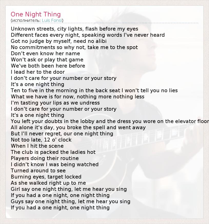 Unknown streets, city lights, flash before my eyes Different faces every night, speaking words I've never heard Got no judge by myself, need no alibi No commitments so why not, take me to the spot Don't even know her name Won't ask or play that game We've both been here before I lead her to the door I don't care for your number or your story It's a one night thing Ten to five in the morning in the back seat I won't tell you no lies What we have is for now, nothing more nothing less I'm tasting your lips as we undress I don't care for your number or your story It's a one night thing You left your doubts in the lobby and the dress you wore on the elevator floor All alone it's day, you broke the spell and went away But I'll never regret, our one night thing Not too late, 12 o' clock When I hit the scene The club is packed the ladies hot Players doing their routine I didn't know I was being watched Turned around to see Burning eyes, target locked As she walked right up to me Girl say one night thing, let me hear you sing If you had a one night, one night thing Guys say one night thing, let me hear you sing If you had a one night, one night thing