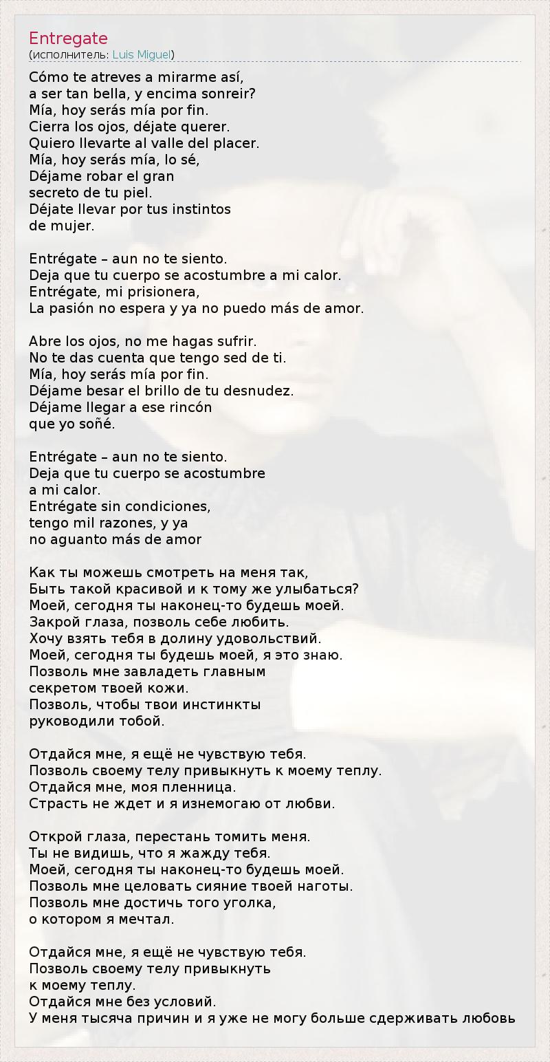 Cómo te atreves a mirarme así, a ser tan bella, y encima sonreir? Mía, hoy serás mía por fin. Cierra los ojos, déjate querer. Quiero llevarte al valle del placer. Mía, hoy serás mía, lo sé, Déjame robar el gran secreto de tu piel. Déjate llevar por tus instintos de mujer. Entrégate – aun no te siento. Deja que tu cuerpo se acostumbre a mi calor. Entrégate, mi prisionera, La pasión no espera y ya no puedo más de amor. Abre los ojos, no me hagas sufrir. No te das cuenta que tengo sed de ti. Mía, hoy serás mía por fin. Déjame besar el brillo de tu desnudez. Déjame llegar a ese rincón que yo soñé. Entrégate – aun no te siento. Deja que tu cuerpo se acostumbre a mi calor. Entrégate sin condiciones, tengo mil razones, y ya no aguanto más de amor Как ты можешь смотреть на меня так, Быть такой красивой и к тому же улыбаться? Моей, сегодня ты наконец-то будешь моей. Закрой глаза, позволь себе любить. Хочу взять тебя в долину удовольствий. Моей, сегодня ты будешь моей, я это знаю. Позволь мне завладеть главным секретом твоей кожи. Позволь, чтобы твои инстинкты руководили тобой. Отдайся мне, я ещё не чувствую тебя. Позволь своему телу привыкнуть к моему теплу. Отдайся мне, моя пленница. Страсть не ждет и я изнемогаю от любви. Открой глаза, перестань томить меня. Ты не видишь, что я жажду тебя. Моей, сегодня ты наконец-то будешь моей. Позволь мне целовать сияние твоей наготы. Позволь мне достичь того уголка, о котором я мечтал. Отдайся мне, я ещё не чувствую тебя. Позволь своему телу привыкнуть к моему теплу. Отдайся мне без условий. У меня тысяча причин и я уже не могу больше сдерживать любовь