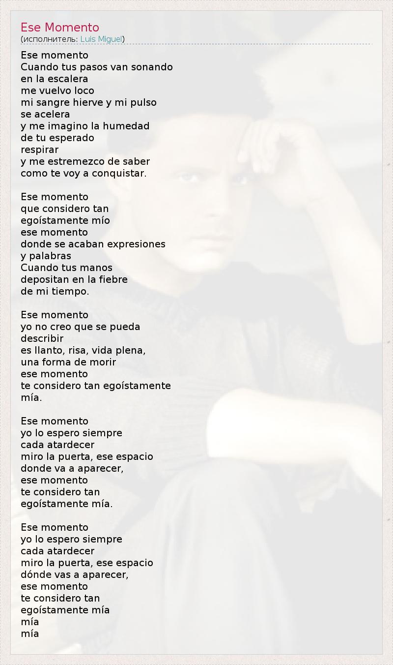 В этот момент, Когда твои шаги звучат на лестнице, Я схожу с ума, Моя кровь закипает и мой пульс ускоряется, И я представляю себе влажный, наполненный тобой воздух от дыхания ожидания, Дрожь пробегает от представления того, Как я буду тебя завоевывать. Этот момент, Который я считаю Таким эгоистичным с моей стороны, Этот момент, где не нужны ни фразы и слова, Когда твои руки Отдают свой жар мне уже не в первый раз. Этот момент... Я не уверен, что смогу описать плач, смех, всю полноту жизни, один из лучших способов умереть, Этот момент, которым я считаю таким эгоистичным с моей стороны. Этот момент... Я его всегда жду, Каждый вечер, Смотря на дверь, в это пространство, Откуда он может возникнуть, Этот момент, которым я считаю таким эгоистичным с моей стороны. Этот момент... Я его всегда жду, Каждый вечер, Смотря на дверь, в это пространство, Откуда он может возникнуть, Этот момент, которым я считаю таким эгоистичным с моей стороны. Моим моим Автор перевода — luis