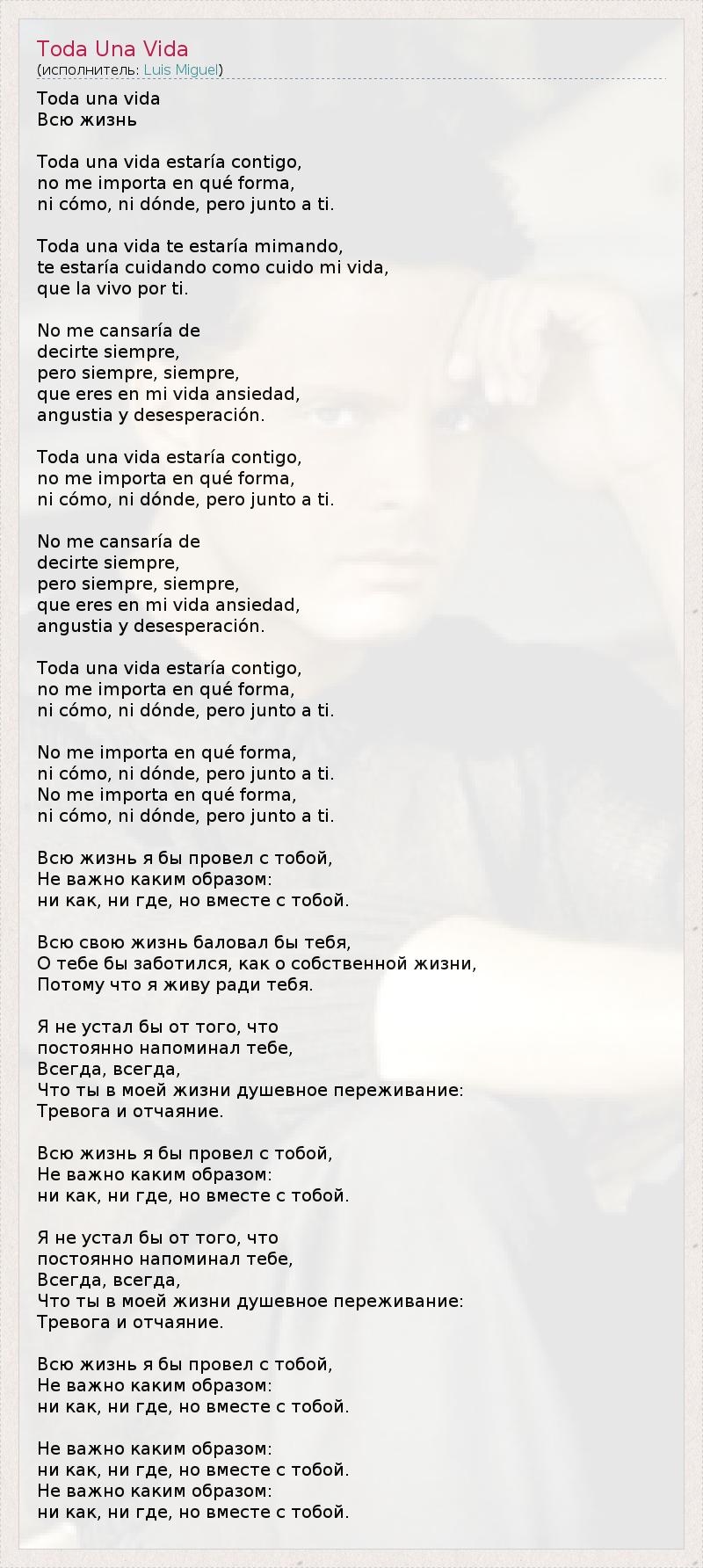 Toda una vida Всю жизнь Toda una vida estaría contigo, no me importa en qué forma, ni cómo, ni dónde, pero junto a ti. Toda una vida te estaría mimando, te estaría cuidando como cuido mi vida, que la vivo por ti. No me cansaría de decirte siempre, pero siempre, siempre, que eres en mi vida ansiedad, angustia y desesperación. Toda una vida estaría contigo, no me importa en qué forma, ni cómo, ni dónde, pero junto a ti. No me cansaría de decirte siempre, pero siempre, siempre, que eres en mi vida ansiedad, angustia y desesperación. Toda una vida estaría contigo, no me importa en qué forma, ni cómo, ni dónde, pero junto a ti. No me importa en qué forma, ni cómo, ni dónde, pero junto a ti. No me importa en qué forma, ni cómo, ni dónde, pero junto a ti. Всю жизнь я бы провел с тобой, Не важно каким образом: ни как, ни где, но вместе с тобой. Всю свою жизнь баловал бы тебя, О тебе бы заботился, как о собственной жизни, Потому что я живу ради тебя. Я не устал бы от того, что постоянно напоминал тебе, Всегда, всегда, Что ты в моей жизни душевное переживание: Тревога и отчаяние. Всю жизнь я бы провел с тобой, Не важно каким образом: ни как, ни где, но вместе с тобой. Я не устал бы от того, что постоянно напоминал тебе, Всегда, всегда, Что ты в моей жизни душевное переживание: Тревога и отчаяние. Всю жизнь я бы провел с тобой, Не важно каким образом: ни как, ни где, но вместе с тобой. Не важно каким образом: ни как, ни где, но вместе с тобой. Не важно каким образом: ни как, ни где, но вместе с тобой.