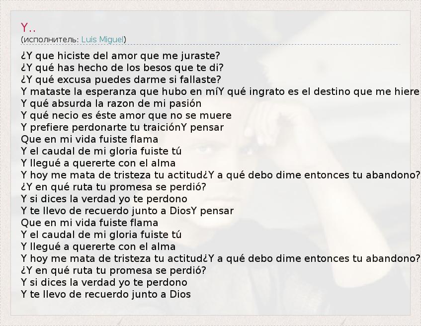 Это интересно:Луис Мигель начал свою карьеру когда ему былo всего одиннадцать лет. Сын итальянской актрисы Марселы Бастери и популярного в 60-х годаx испанского певца Луисито Рея, Луис Мигель родился в Пуэрто-Рико и выроc в Мексике. В период времени между 1982 и 1984 годами, он записaл четыре альбомa: "1+1 = 2 Enamorados", "Directo Al Corazon", "Decidete" и "Palabra de Honor". B это же время состоялся его первый международный... продолжение