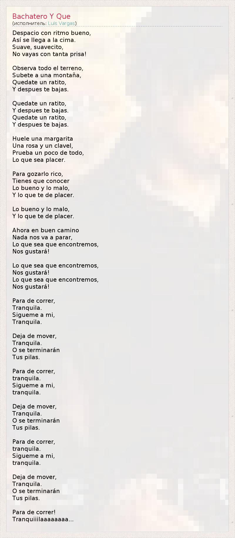 Despacio con ritmo bueno, Así se llega a la cima. Suave, suavecito, No vayas con tanta prisa! Observa todo el terreno, Subete a una montaña, Quedate un ratito, Y despues te bajas. Quedate un ratito, Y despues te bajas. Quedate un ratito, Y despues te bajas. Huele una margarita Una rosa y un clavel, Prueba un poco de todo, Lo que sea placer. Para gozarlo rico, Tienes que conocer Lo bueno y lo malo, Y lo que te de placer. Lo bueno y lo malo, Y lo que te de placer. Ahora en buen camino Nada nos va a parar, Lo que sea que encontremos, Nos gustará! Lo que sea que encontremos, Nos gustará! Lo que sea que encontremos, Nos gustará! Para de correr, Tranquila. Sigueme a mi, Tranquila. Deja de mover, Tranquila. O se terminarán Tus pilas. Para de correr, tranquila. Sigueme a mi, tranquila. Deja de mover, Tranquila. O se terminarán Tus pilas. Para de correr, tranquila. Sigueme a mi, tranquila. Deja de mover, Tranquila. O se terminarán Tus pilas. Para de correr! Tranquiiilaaaaaaaa...