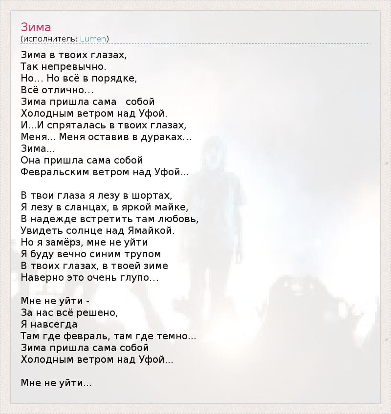 Зима в твоих глазах, Так непревычно. Но… Но всё в порядке, Всё отлично… Зима пришла сама собой Холодным ветром над Уфой. И...И спряталась в твоих глазах, Меня... Меня оставив в дураках… Зима... Она пришла сама собой Февральским ветром над Уфой... В твои глаза я лезу в шортах, Я лезу в сланцах, в яркой майке, В надежде встретить там любовь, Увидеть солнце над Ямайкой. Но я замёрз, мне не уйти Я буду вечно синим трупом В твоих глазах, в твоей зиме Наверно это очень глупо… Мне не уйти - За нас всё решено, Я навсегда Там где февраль, там где темно... Зима пришла сама собой Холодным ветром над Уфой... Мне не уйти...