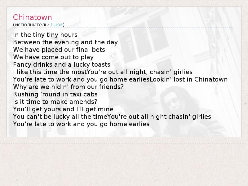 In the tiny tiny hours Between the evening and the day We have placed our final bets We have come out to play Fancy drinks and a lucky toasts I like this time the mostYou're out all night, chasin' girlies You're late to work and you go home earliesLookin' lost in Chinatown Why are we hidin' from our friends? Rushing 'round in taxi cabs Is it time to make amends? You'll get yours and I'll get mine You can't be lucky all the timeYou're out all night chasin' girlies You're late to work and you go home earlies