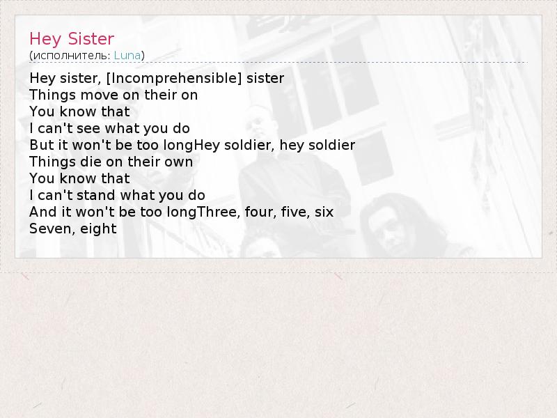 Hey sister, [Incomprehensible] sister Things move on their on You know that I can't see what you do But it won't be too longHey soldier, hey soldier Things die on their own You know that I can't stand what you do And it won't be too longThree, four, five, six Seven, eight
