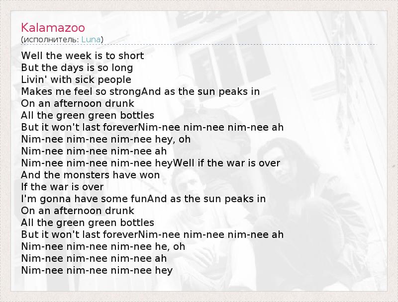 Well the week is to short But the days is so long Livin' with sick people Makes me feel so strongAnd as the sun peaks in On an afternoon drunk All the green green bottles But it won't last foreverNim-nee nim-nee nim-nee ah Nim-nee nim-nee nim-nee hey, oh Nim-nee nim-nee nim-nee ah Nim-nee nim-nee nim-nee heyWell if the war is over And the monsters have won If the war is over I'm gonna have some funAnd as the sun peaks in On an afternoon drunk All the green green bottles But it won't last foreverNim-nee nim-nee nim-nee ah Nim-nee nim-nee nim-nee he, oh Nim-nee nim-nee nim-nee ah Nim-nee nim-nee nim-nee hey