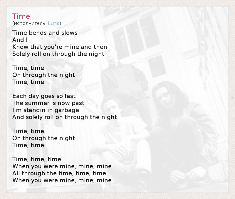 Time bends and slows And I Know that you're mine and then Solely roll on through the night Time, time On through the night Time, time Each day goes so fast The summer is now past I'm standin in garbage And solely roll on through the night Time, time On through the night Time, time Time, time, time When you were mine, mine, mine All through the time, time, time When you were mine, mine, mine
