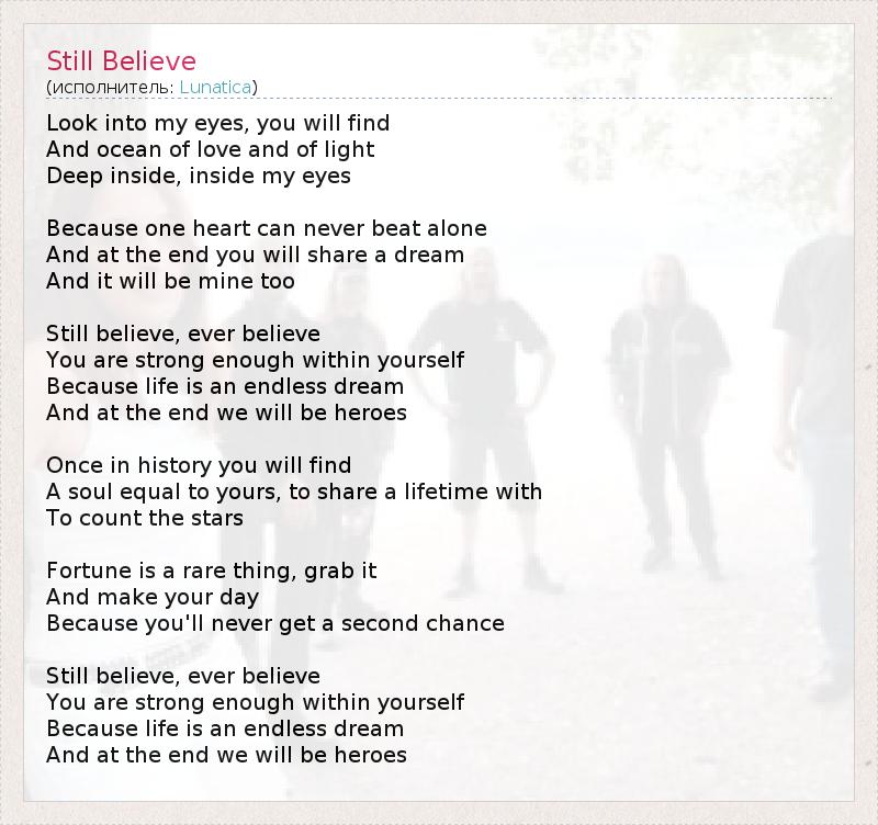 Посмотри в мои глаза, и ты найдёшь Океан любви и света, Лежащий глубоко внутри... Потому что сердце никогда не сможет биться в одиночестве, И, в конце концов, ты разделишь свои сны со мной, И они станут моими тоже. Всё ещё верю, буду верить всегда, Ты достаточно силён внутри себя, Так как жизнь – бесконечная мечта, В конце концов, мы будем героями. Однажды в прошлом ты найдёшь Вторую половинку своей души, с которой и разделишь жизнь, Считая звёзды... Счастье – это редкость, хватай его И сделай частью своей жизни, Ведь второго шанса никогда не будет. Всё ещё верю, буду верить всегда, Ты достаточно силён внутри себя, Так как жизнь – бесконечная мечта, В конце концов, мы будем героями.